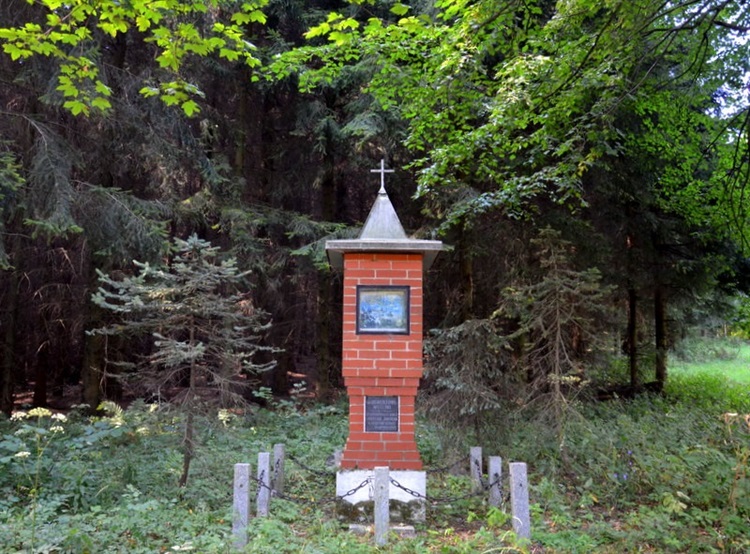 Ten współczesny obiekt typu słupowego postawiony jest na podstawie, na której prawdopodobnie znajdowała się Pieta. Kapliczka murowana z czerwonej cegły. Pierwsza część z tablicą fundacyjną węższa i niższa. Druga część w ścianie frontowej posiada przeszkloną wnękę, w której umieszczony jest obraz przedstawiający scenę z polowania. W scenie tej myśliwemu ukazuje się biały jeleń z jarzącym się krzyżem pośród poroża.