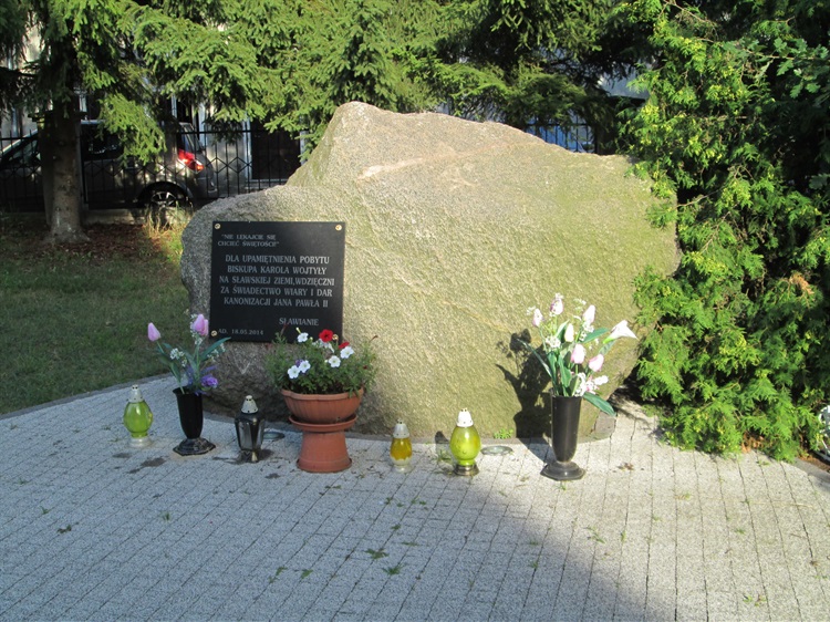 Przy kościele p.w. Michała Archanioła w Sławie znajduje się głaz narzutowy z tablicą pamiątkową upamiętniającą pobyt biskupa Karola Wojtyły na sławskiej ziemi. Tablica ufundowana została przez mieszkańców miasta w 2014 roku.