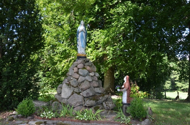 Na terenie byłego cmentarza, nieopodal kościoła Wniebowzięcia NMP wzniesionego przez hrabiego Reinhold von Krockow w 1659 r. usytuowana jest kompozycja nawiązująca do objawień w Lourdes. Co prawda nie ma tutaj groty, ale jest Matka Boska stojąca na wysokiej stożkowej podstawie wykonanej z kamieni oraz klęcząca u podnóża podstawy wiejska dziewczyna Bernadette Soubirous, której szesnaście razy objawiła się MB. Figura Bernadette Soubirous wieńczy fragment starego nagrobka.