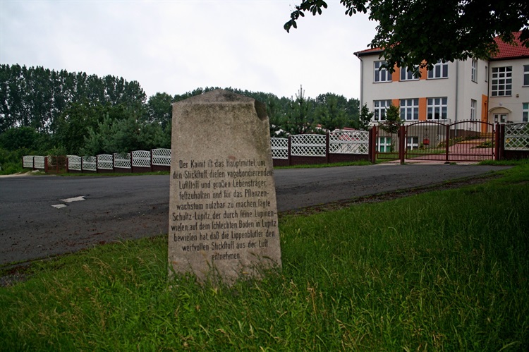 Tekst wyryty na kamieniu, w wolnym tłumaczeniu brzmi: „Kainit jest, obok azotu, głównym składnikiem wędrującym w powietrzu i wielkim nośnikiem życia umożliwiającym wzrost roślin. Jego użyteczną funkcję stwierdził Schultz - Lupitz na swoich łubinowych łąkach, na złych glebach. Lupitz dowiódł, że rośliny motylkowe pobierają z powietrza cenny azot”