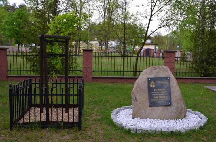 Dąb upamiętniający papieża Jana Pawła II został posadzony w dniu 13.05.2011 r. obok kościoła pw. św. Franciszka z Asyżu. Przed uszkodzeniem zabezpieczony jest metalowym ogrodzeniem. Obok na kamieniu umieszczono tablicę pamiątkową z herbem papieskim informującą komu drzewko jest poświęcone.