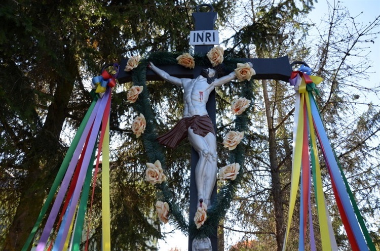 Krzyż przydrożny ustawiony jest na kamiennej podstawie. Postawiony został w 1973 roku. Centralne miejsce na krzyżu zajmuje postać ukrzyżowanego Chrystusa. Nad jego głową umieszczony jest kartusz INRI. Poniżej figury umieszczona jest płaskorzeźba popiersia MB i fragment modlitwy "KTÓRYŚ CIERPIAŁ ZA NAS RANY, JEZU CHRYSTE ZMIŁUJ SIĘ NAD NAMI". Krzyż ozdobiony jest sztucznymi kwiatami i wstęgami.