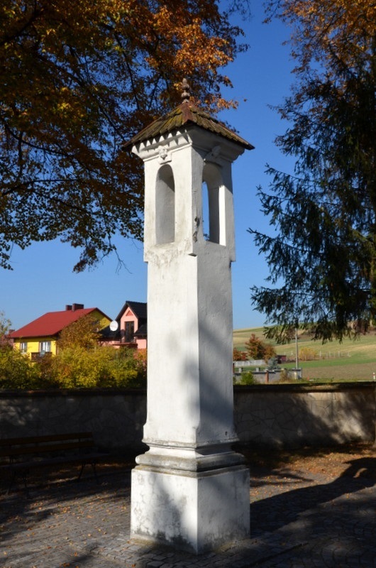Druga kapliczka stoi przed dzwonnicą, na skraju alejki prowadzącej do kościoła. Jest to kapliczka postawiona na rzucie kwadratu z niską podstawą zakończoną gzymsem, nad którą wznoszą się trzy kondygnacje kapliczki oddzielone gzymsami. Kapliczka nakryta jest czterospadowym daszkiem, na którym umieszczona jest kamienna rzeźba (kobieta z psem). Ściany kapliczki posiadają płyciny.