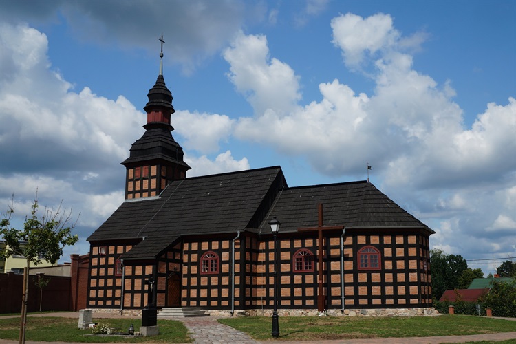 Pierwszą świątynię w Czarnem zbudowano w 1395 r. Ona i dwie następne spłonęły w trawiących miejscowość pożarach. Obecnie istniejący kościół zbudowano w 1757 r. jako charakterystyczną ryglową budowlę tzw. pruski mur z wieżą zwieńczoną barokowym hełmem. Wewnątrz jest bogaty barokowy wystrój z ołtarzem z 1 polowy XVIII w. Najstarszym zabytek - kamienna gotycka chrzcielnica - prawdopodobnie z XIV w. służy jako kropielnica.