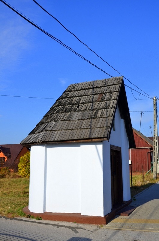 Kapliczka domkowa wzniesiona została w XIX lub na początku XX wieku. Zbudowana jest na rzucie prostokątna zamkniętego półokrągło, murowana, otynkowana i nakryta dachem dwuspadowym krytym gontem. Naroża kapliczki i ściany bocznie wzmocnione płaskimi filarami. Prostokątne wejście zabezpieczone drewnianymi przeszklonymi drzwiami. Nad wejściem przeszklona wnęka z obrazem MB, a nad wnęką metalowy krzyż. Wewnątrz na przyściennym ołtarzyku obraz Matki Boskiej Częstochowskiej.