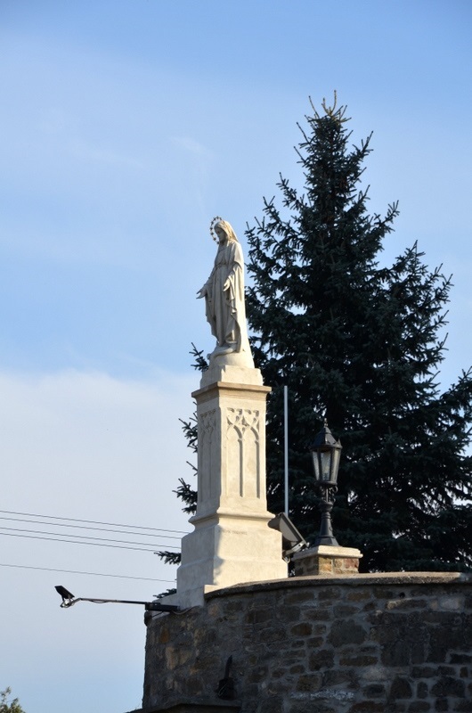 Postument stoi nad rynkiem przed kościołem pw. Podwyższenia Krzyża Świętego. Podłużny cokół posadowiony jest na trzystopniowej podstawie. Na tylnej ścianie cokołu wyryta jest inskrypcja "DO KOGÓŻ WZDYCHAĆ MAMY NĘDZNE DZIATKI, TYLKO DO CIEBIE UKOCHANEJ MATKI". Cokół wieńczy figura Matki Boskiej Niepokalanego Poczęcia. MB z aureolą nad głową, rozłożonymi rękami i otwartymi dłońmi stoi na kuli ziemskiej depcząc łeb piekielnego węża. Postument jest pamiątką pielgrzymki na Jasną Górę, która miała miejsce w 1908 r.