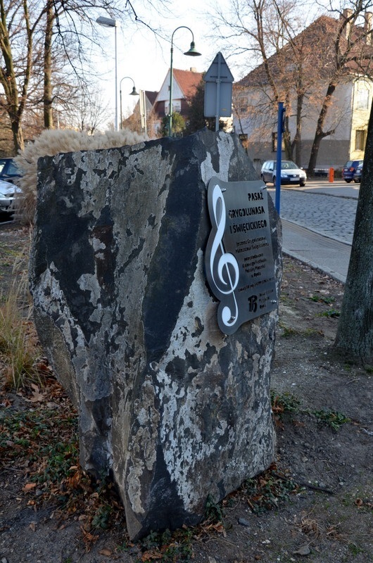 Głaz z tablicą pamiątkową upamiętniającą twórców festiwalu polskiej piosenki stoi na skwerze pomiędzy ulicą Norberta Barlickiego a pasażem, który na wniosek Towarzystwa Przyjaciół Opola nosi również imię twórców festiwalu. Są to dziennikarze: Jerzy Grygolunas i Mateusz Święcicki. Na głazie umieszczona została tablica pamiątkowa, na której umieszczony jest klucz wiolinowy i treść "PASAŻ GRYGOLUNASA I ŚWIĘCICKIEGO / Jerzemu Grygolunasowi, Mateuszowi Święcickiemu pomysłodawcom Krajowego Festiwalu Polskiej Piosenki w Opolu z okazji 50 edycji KFPP (1963-2013) / Towarzystwo Przyjaciół Opola".