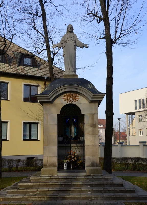 Kaplica stoi naprzeciwko głównego wejścia do kościoła pw. Najświętszego Serca Pana Jezusa. Jest to obiekt posadowiony na kilkustopniowym podwyższeniu, jest murowany z bloków kamiennych i zwieńczony czterospadowym dachem. Na podwyższeniu stoi kamienna figura patrona świątyni, Jezusa. Jest to wizerunek Najświętszego Serca Pana Jezusa z rozłożonymi rękami i gorejącym sercem na wierzchu. Wewnątrz, na przyściennym ołtarzu stoi figura Matki Boskiej Niepokalanego Poczęcia. MB okryta jest niebieskim płaszczem; z rozłożonymi rękami i otwartymi dłońmi stoi na kuli ziemskiej i depcze łeb piekielnego węża. Wejście do kaplicy zabezpieczone ozdobną metalową kratą.