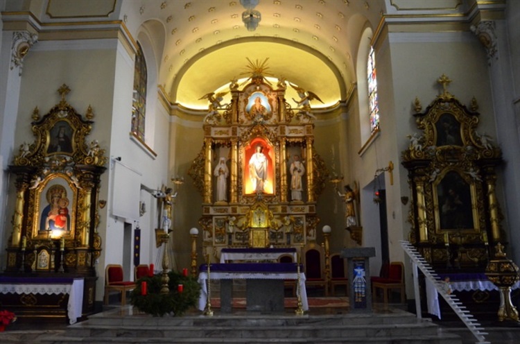 Wyposażenie świątyni to: wykonane w stylu barokowym ołtarz główny z figurą Najświętszego Serca Pana Jezusa, dwa ołtarze boczne oraz ambona, ponadto uwagę zwracają figury świętych stojące na przyściennych konsolach i piękne witraże w oknach.
