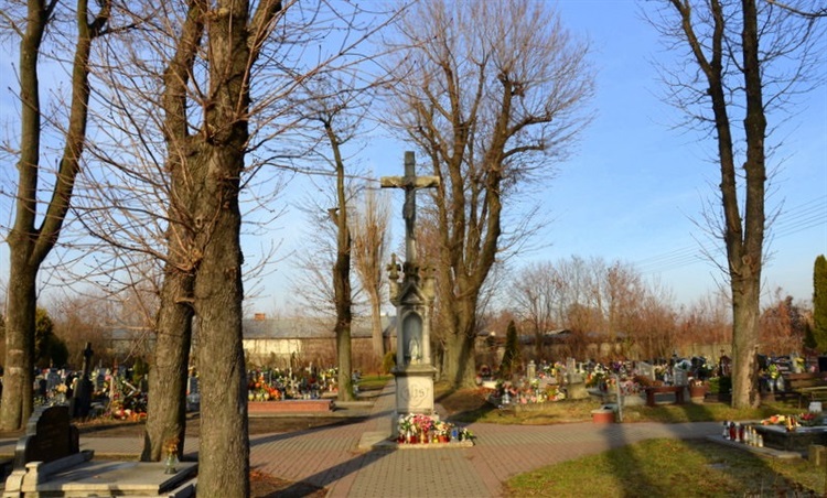 Układ komunikacyjny cmentarza stanowią dwie przecinające się aleje w kształcie krzyża. Na przecięciu alei, w roku 1906 ustawiony został krzyż. Krzyż z figurą ukrzyżowanego Chrystusa wieńczy cokół z dwuczęściową podstawą posadowioną na betonowym podwyższeniu. Wyższa część podstawy zawiera monogram IHS, a cokół - półokrągło zamkniętą wnękę z figurką MB.
