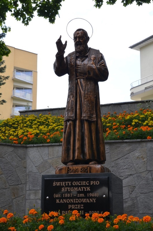 Pienińska Uzdrowiskowa Klinika Rehabilitacji i Leczenia Bólu nosi imię św. Ojca Pio. Rzeźba przedstawiająca św. Ojca Pio stoi również przed obiektami kliniki. Figura przedstawiająca świętego wieńczy prosty cokół, na którym przytwierdzona jest tablica o treści "ŚWIĘTY OJCIEC PIO STYGMATYK (ur. 1887 – zm. 1968) KANONIZOWANY PRZEZ JANA PAWŁA II w 2002 r". Na jednej ze ścian muru oporowego otaczającego z trzech stron pomnik przytwierdzona jest tablica z modlitwą błagalną do świętego Ojca Pio.