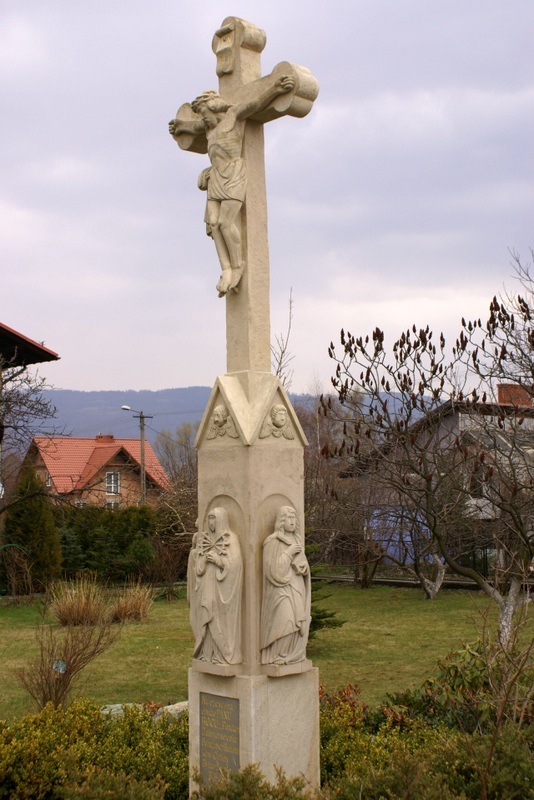 Kamienny krzyż fundują mieszkańcy miejscowości w 1896 r. W latach 20-tych XX wieku ulega uszkodzeniu i zostaje zakopany na placu kościelnym. Krzyż podczas rozbudowy świątyni zostaje w 2004 r. odkopany i odrestaurowany w 2009 r. Na krzyżu wieńczącym wysoki cokół figura ukrzyżowanego Chrystusa.