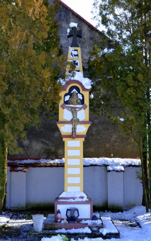 Pomnik upamiętniający poległych w latach 1914 – 1918 został wzniesiony po zakończeniu I wojny światowej. Podstawa pomnika pozbawiona jest tabliczek inskrypcyjnych, które zostały usunięte po 1945 r. Cokół pomnika zakończony jest wygiętym gzymsem i kamiennymi kulami w rogach. Na cokole umieszczone są dwie płaskorzeźby: jedna to Pan Jezus na krzyżu i druga przedstawiająca popiersie Boga Ojca. Cokół wieńczy zwężająca się ku górze podstawa, na której umieszczony jest Krzyż Żelazny (Eisernes Kreuz) – najwyższe niemieckie odznaczenie wojskowe. W płycinach podstawy umieszczone zostały motywy militarne: Krzyż Żelazny, flaga i wieniec laurowy.