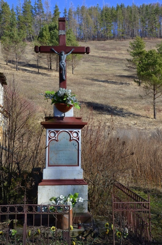 Krzyż stoi na samym początku wsi. Na ścianie tylnej cokołu wyryta jest data jego wzniesienia - 1884 r i nazwisko fundatora lub wykonawcy – A. Mihlan. Cokół zakończony gzymsem i zwieńczony krzyżem stoi na dwustopniowej podstawie również zakończonej gzymsem. W płycinie frontowej ściany cokołu wyryta jest inskrypcja w języku niemieckim. Cokół wieńczy drewniany krzyż z figurą ukrzyżowanego Chrystusa i kartuszem I.N.R.I. Pierwotnie był to krzyż wykonany z kamienia. Podczas silnej wichury pod koniec 2013 r. krzyż u podstawy został złamany. Obecnie leży z tyłu oparty o cokół. Figurka Chrystusa ze złamanego krzyża została zdemontowana i obecnie znajduje się na obecnym drewnianym krzyżu.