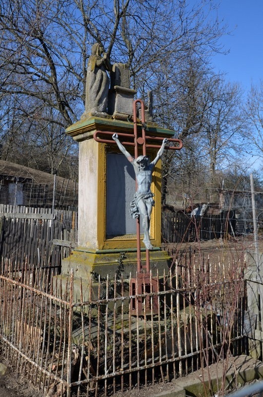 Zdewastowana kompozycja rzeźbiarska "Ukrzyżowanie" stoi na terenie prywatnej posesji przy ul. 1 Maja. Postument otoczony jest niskim metalowym ogrodzeniem. Cokół zakończony gzymsem, na którym znajdowała się grupa figuralna posadowiony jest na dwustopniowej podstawie. W płycinie frontowej ściany cokołu wyryta jest inskrypcja. Głównym elementem postumentu była kompozycja rzeźbiarska przedstawiająca ukrzyżowanie Chrystusa. Z kompozycji tej niestety pozostała jedna figura przedstawiająca Matkę Boską Bolesną. Od frontu o cokół oparty jest metalowy krzyż z figurą ukrzyżowanego Chrystusa.