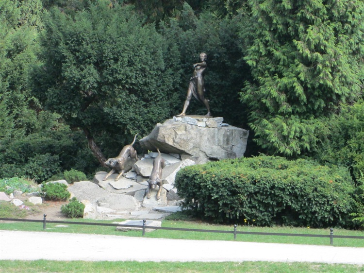 Polująca Diana jest dziełem rzeźbiarza Ernsta Segera. Przedstawia postać polującej bogini i dwóch biegnących psów myśliwskich. Po raz pierwszy została odsłonięta 16 sierpnia 1898 roku. Zaginęła po II wojnie światowej. Dzięki staraniom Społecznego Komitetu Rekonstrukcji Pomnika Diany została odtworzona przez Ryszarda Zaryckiego. Ponownie na Skwerze Zbyszka Cybulskiego, u zbiegu ulic Mickiewicza i Olszewskiego stanęła w 2015 roku.