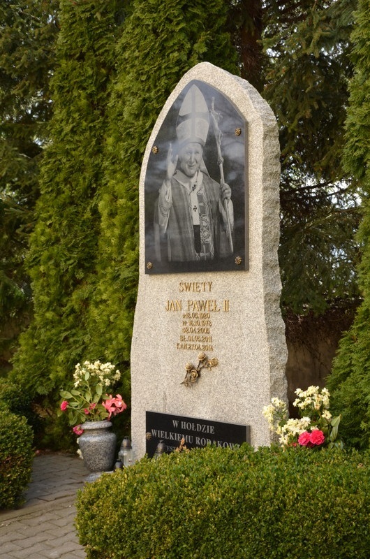 Pomnik poświęcony pamięci św. Jana Pawła II stoi obok kościoła pw. Matki Boskiej Niepokalanie Poczętej. Jest to wysoka granitowa płyta, na której w górnej części umieszczono na czarnej płycie popiersie św. Jana Pawła II, a poniżej pięć dat:ur.18.05.1920 r., wyboru na papieża 16.10.1978 r., śmierci 2.04.2005 r., beatyfikacji 01.05.2011 i kanonizacji 27.04.2014 r. Na samej dole przytwierdzona jest tablica fundacyjna.