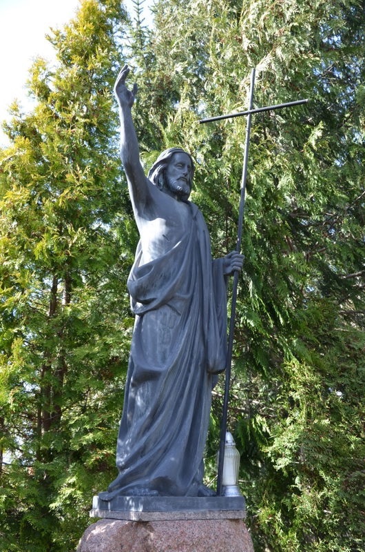 Współczesna figura Pana Jezusa usytuowana jest przy wejściu na przykościelny cmentarz. Figura stoi na dużym kamieniu, na którym przytwierdzona jest tablica o treści "Ja Jestem Zmartwychwstanie i Życie". Stojący na kamieniu Jezus przedstawiony jest z prawą ręką uniesioną do góry i dużym krzyżem trzymanym w lewej ręce.