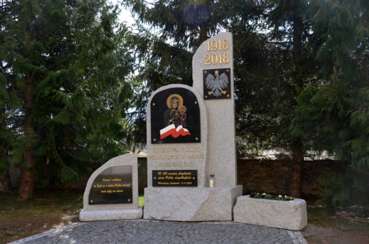 Pomnik składający się z różnej wielkości płyt granitowych stoi na terenie kościoła pw. Niepokalanego Poczęcia NMP. Wzniesiony został 11.11.2018 r., a więc 100 lat po odzyskaniu niepodległości przez Polskę. Najwyższa płyta zawiera datę 1918 – 2018 oraz poniżej Godło Polski. Na nieco niższej płycie umieszczone zostało popiersie Matki Bożej z Dzieciątkiem i pofałdowana flaga narodowa. Poniżej napis o treści "KRÓLOWO POLSKI, WOLNOŚĆ, POKÓJ I MIŁOŚĆ RACZ NAM DAĆ" oraz napis informujący o przeznaczeniu pomnika. Na najmniejszej płycie umieszczona została treść "Pamięć i modlitwa za tych co o wolną Polskę walczyli niech nigdy nie ustanie".