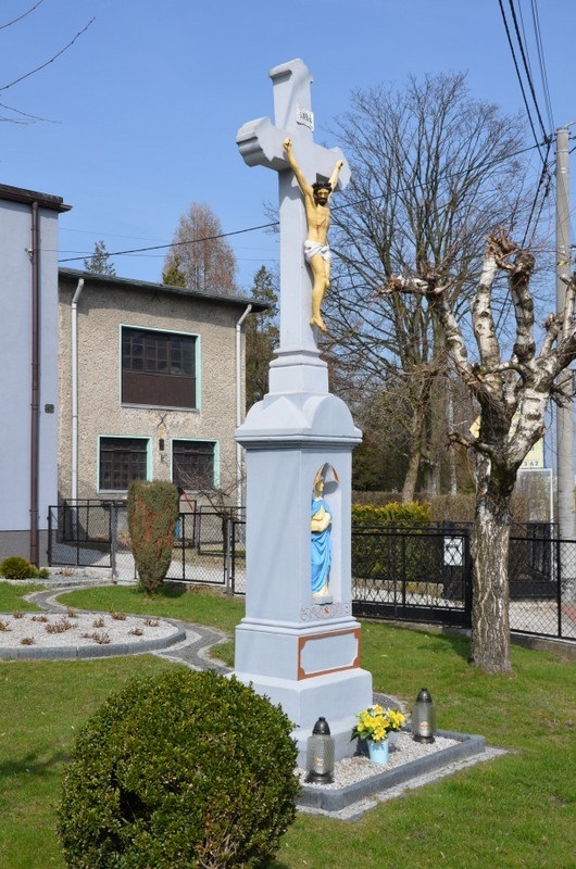 Krzyż wieńczy cokół posadowiony na kilkustopniowej podstawie. Ściankę frontową najwyższej części podstawy zajmuje płycina. Cokół z wnęką zakończoną ostrym łukiem zwieńczony jest masywnym gzymsem. We wnęce stoi figurka Matki Boskiej Bolesnej nakrytej niebieskim płaszczem i dłońmi splecionymi na prawym boku. Na krzyżu figura ukrzyżowanego Chrystusa z koroną cierniową na głowie i przebitym prawym bokiem. Nad głową Chrystusa pionowy, lekko pofałdowany kartusz INRI.