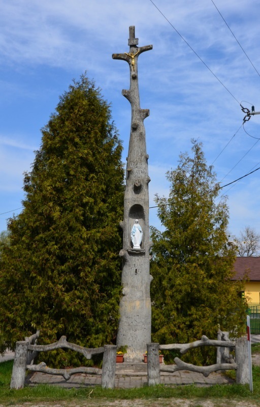Krzyż przydrożny, stojący przy głównej drodze poprowadzonej przez wieś (ul. Lubelska) to wysoki zwężający się ku górze betonowy pień z wystającymi, poodcinanymi konarami. W zwieńczeniu mała wykonana z brązu figurka ukrzyżowanego Chrystusa, a nad jego głową pionowy kartusz INRI. Poniżej, we wnęce stoi figurka Matki Boskiej Niepokalanego Poczęcia. Całość ogrodzona niskim betonowym ogrodzeniem.