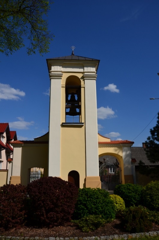 W mur otaczający teren kościoła pw. św. Apostołów Piotra i Pawła i byłego cmentarza przykościelnego wkomponowana jest dzwonnica i trzy kapliczki. Dzwonnica wzniesiona jest na rzucie kwadratu, jest murowana, otynkowana i nakryta czterospadowym dachem z krzyżem na szczycie. Elewacje zdobią pilastry w narożach, rozbudowany gzyms biegnący poniżej okapu dachu oraz duże prostokątne otwory zakończone łukiem. W dzwonnicy znajdują się dwa dzwony wykonane w 1954 r. w firmie Felczyńskiego z Przemyśla. Po obu stronach dzwonnicy, bramy wejściowe na teren kościoła.