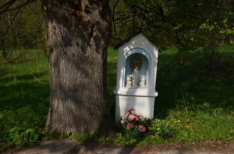 Kapliczka stoi poniżej kościółka pw. NSPJ obok potężnej 100-letniej lipy. Jest to kapliczka słupowa, murowana na rzucie prostokąta i przykryta jest dwuspadowym dachem. Nad gzymsem dzielącym kapliczkę na dwie części wykonana jest duża zamknięta łukiem wnęka. Wewnątrz na tle monogramu IHS stoi figurka Matki Boskiej Niepokalanego Poczęcia, a obok figurki dwóch aniołków.