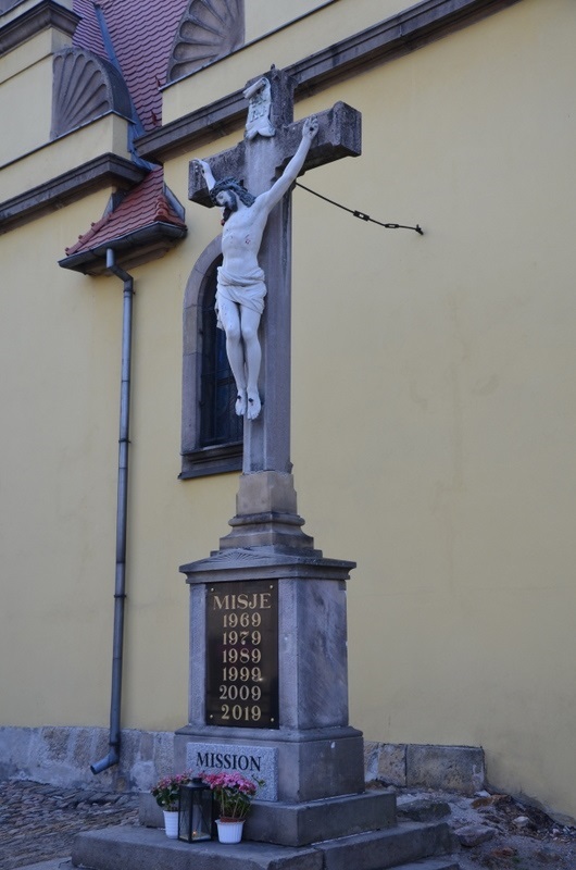 Krzyż misyjny stoi przy kościele pw. św. Michała Archanioła. Wzniesiony został w 1851 r, gdyż taka data wyryta jest na tablicy przytwierdzonej do podstawy posadowionej na trzystopniowym podwyższeniu. Na podstawie prosty cokół zakończony gzymsem i tablicą z datami, w których odprawiane były rekolekcje (1969, 1979, 1989, 1999, 2009 i 2019). Cokół wieńczy krzyż posadowiony dodatkowo na stopce. Na krzyżu figura ukrzyżowanego Chrystusa, a nad głową pionowy, pofałdowany kartusz INRI.