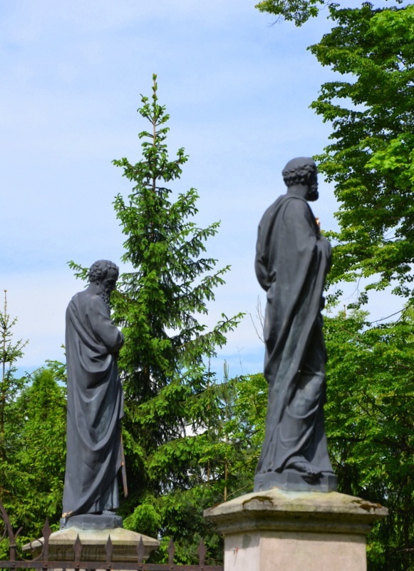 Na bramach prowadzących na teren przed kościołem pw. Nawiedzenia Najświętszej Maryi Panny umieszczone są cztery rzeźby przedstawiające świętych. Dwie figury wieńczą bramę przed wejściem do świątyni. Przedstawiają apostołów: Piotra z kluczem i księgą i Pawła z mieczem. Kolejne dwie postacie wieńczą bramę od strony prezbiterium. Jedną z nich jest święty ojciec Pio, a drugą święty Florian.