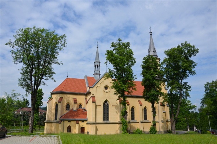 Obecny kościół pw. Nawiedzenia Najświętszej Maryi Panny jest trzecim z kolei kościołem we wsi. Pierwszy został wzniesiony 1325 r. i rozebrany przed 1596 r. Na jego miejscu w 1596 r. postawiony został kościół drewniany fundacji Piotra Nawojowskiego. W związku z budową nowej murowanej świątyni, kościół ten został rozebrany w 1895 r. Trzecia murowana świątynia fundacji rodziny hr. Stadnickich wzniesiona została w latach 1894-1898. Powstała wg projektu inż. Władysława Chorążego z Nowego Sącza. 20.08.1898 r. odbyła się uroczystość konsekracji świątyni, a dokonał tego biskup Ignacy Łoboz.