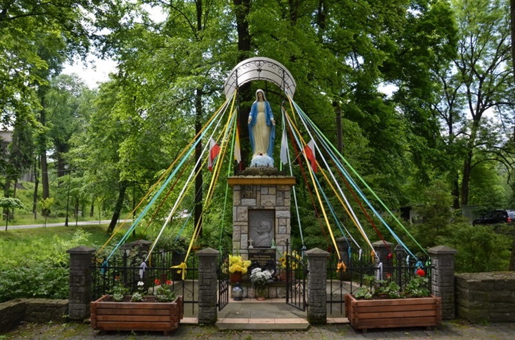 Figura Matki Boskiej Niepokalanego Poczęcia wieńczy murowany z kamienia cokół. Matka Boża w niebieskim płaszczu, z rozłożonymi rękami i otwartymi dłońmi, stoi na kuli ziemskiej i depcze łeb piekielnego węża trzymającego w paszczy jabłko. Figurę osłania plastikowy daszek zamontowany na ozdobnej metalowej konstrukcji. W ścianach cokołu wykonane są prostokątne płyciny, w których umieszczona jest figurka Matki Boskiej z Dzieciątkiem, płaskorzeźba papieża Jana Pawła II, a w dwóch pozostałych fragment modlitwy i monogram Matki Boskiej. Teren wokół postumentu ogrodzony elementami metalowymi montowanymi do murowanych z kamienia słupków.