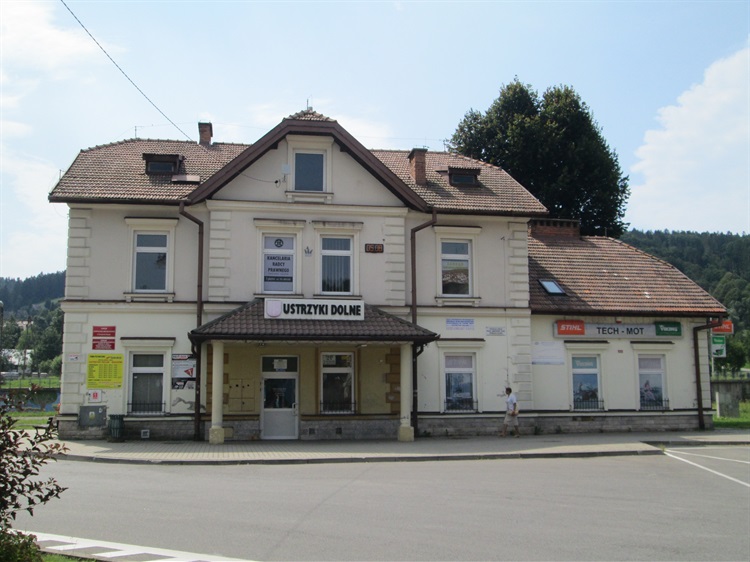 Stacja kolejowa w Ustrzykach Dolnych otwarta została w 1872 roku. Jest to największa stacja na odcinku Nowy Zagórz – Krościenko. Posiada dwa tory główne oraz kilka torów bocznych, które prowadzą do placu ładunkowego i rampy.