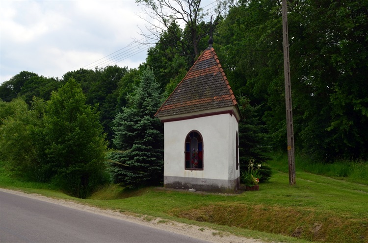 Kapliczka została ufundowana przez ziemiańską rodzinę Lewickich. Ma ona formę masywnego, trójkątnego słupa przykrytego trójspadowym dachem. W głębokich, przeszklonych wnękach znajdują sie figury Serca Pana Jezusa, Matki Bożej i NMP Niepokalanie Poczętej. Kapliczka stoi przy drodze do dworu.