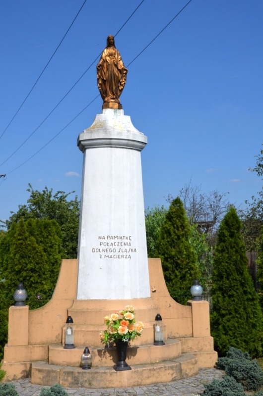 Po II wojnie światowej zmieniono przeznaczenie pomnika. Usunięto nazwiska poległych oraz niemieckie motywy militarne. Na cokole pomnika wyryty został napis "NA PAMIĄTKĘ POŁĄCZENIA DOLNEGO ŚLĄSKA Z MACIERZĄ", a cokół wieńczyła figurka św. Franciszka. Kiedy nieznany sprawca uszkodził figurkę świętego w 1972 r. umieszczona została na nim figura Matki Boskiej.