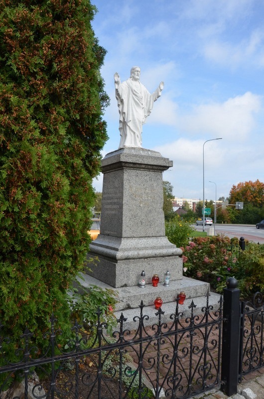 Rzeźba Chrystusa znajduje się na Placu Jana Pawła II, za prezbiterium kościoła pw. Najświętszej Marii Panny Wspomożenia Wiernych. Postument otoczony jest niskim, ozdobnym, metalowym ogrodzeniem. Rzeźba Chrystusa wieńczy prosty cokół posadowiony na kilkustopniowej podstawie. W wizerunku tym Chrystus przedstawiony jest z gorejącym sercem na wierzchu. Na frontowej stronie cokołu słabo widoczna inskrypcja "Serce Jezusa Błogosław Nam".