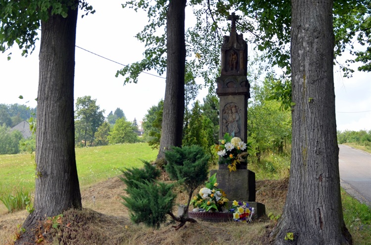 Płaskorzeźba z postacią Chrystusa została umieszczona we wnęce wykutej w głowicy kapliczki słupowej wykonanej z piaskowca. Na frontowej ścianie czworobocznej kolumny umieszczona została płaskorzeźba nawiązująca prawdopodobnie do wizerunku Matki Bożej Pompejańskiej z dzieciątkiem wręczającym różaniec świętemu Dominikowi. Na cokole został wyryty rok ufundowania kapliczki. Kapliczka wraz z otaczającym ją drzewostanem została wpisana do gminnej ewidencji zabytków.