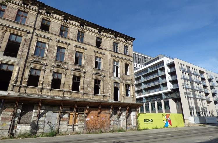 Jej świetność dawno minęła… pozbawiona balkonów, gdzieniegdzie pozostałości po pięknych dekoracjach elewacji, wyłączona całkowicie z użytkowania stoi i ulega destrukcji. Za jej „plecami rośnie” nowoczesne osiedle…