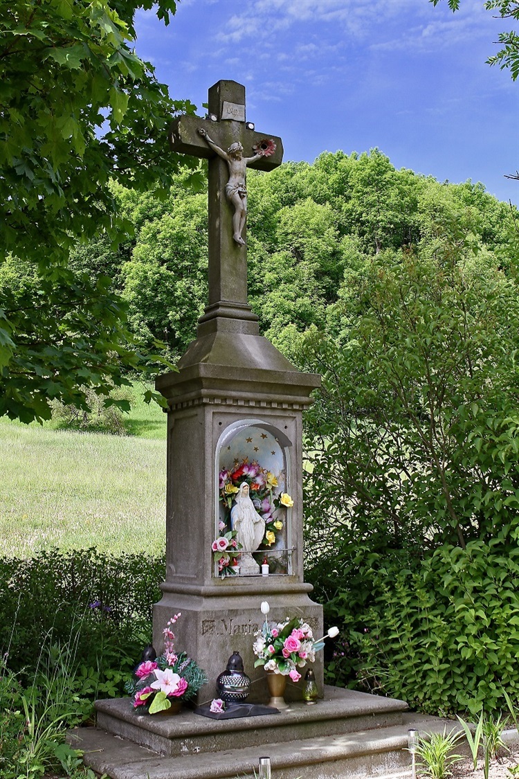 Wędrując niebieskim szlakiem w kierunku ruin zamku Homole u podnóża góry Gomoła napotkamy krzyż Męka Pańska. Kamienny krzyż z figurą Chrystusa Ukrzyżowanego wraz z umieszczoną we wnęce postumentu figurą Matki Boskiej stoi na kamiennej podstawie przy polnej drodze.