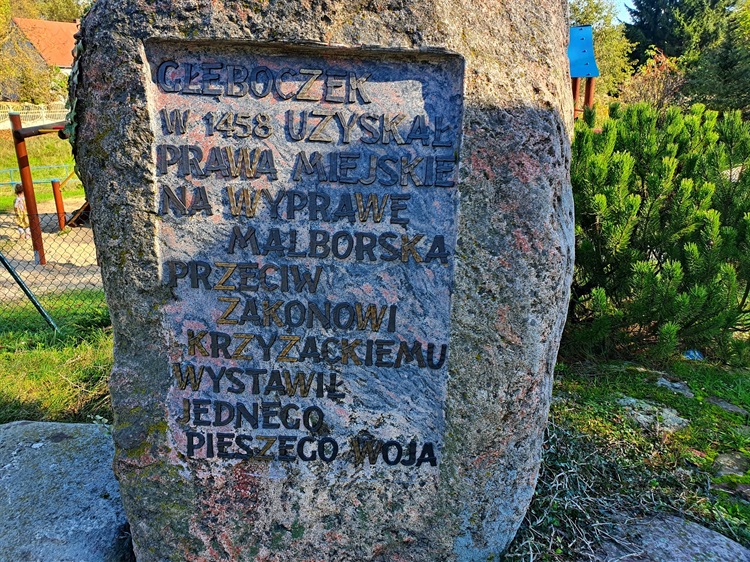 Głęboczek dawno temu był miastem i choć dzisiaj naprawdę trudno to sobie wyobrazić (a może właśnie dlatego), o dawnej świetności dumnie wspomina głaz stojący przy placu zabaw, nad brzegiem niedużego jeziorka. Czytamy na nim, że prawa miejskie pochodzą z roku 1458 oraz, oraz że na wyprawę malborską przeciw Krzyżakom wyruszył stąd jeden pieszy woj. Miejscowi wspominają czasy, gdy na łączce za głazem jeszcze kilkanaście lat temu była dzika plaża, teraz wykąpać już się tutaj nie da, ale odpocząć na ładnie zaaranżowanym skwerku, jak najbardziej.