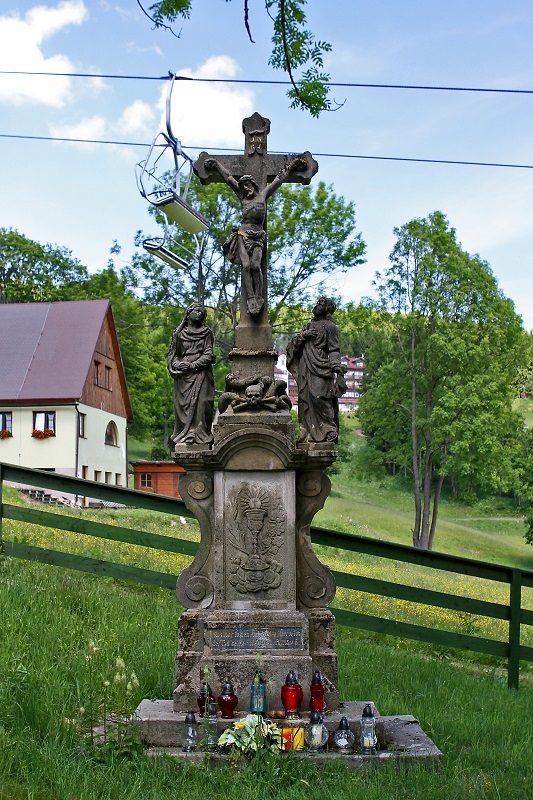 Na cmentarzu w Zieleńcu zachowała grupa figuralna Ukrzyżowanie. Kamienna rzeźba pochodzi z II połowy XIX wieku. Grupę tworzą trzy rzeźby: Marii, św. Jana oraz Jezusa Chrystusa Ukrzyżowanego. Na postumencie widnieje napis: "Kostbar in den Augen des Herrn ist der Tod seiner Heiligen. Ps.115.v6.“ Na tylnej ścianie postumentu napis: "A.Adolph in Glatz - 1866".