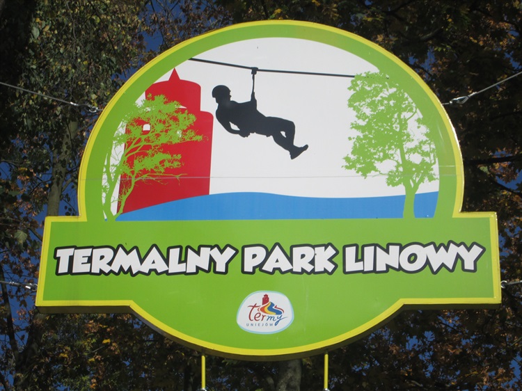 Termalny Park Linowy znajduje się na terenie zabytkowego parku, niedaleko zamku. Jego otwarcie miało miejsce w czerwcu 2017 roku. Park linowy posiada pięć tras o zróżnicowanym poziomie trudności, dzięki czemu mogą z niego korzystać zarówno dorośli jak i dzieci. Trasa dla dzieci zabezpieczona jest na całej długości siatką asekuracyjną. Dostępne są również cztery trasy: niska, średnia, wysoka oraz zjazdowa, wyposażone w system ciągłej asekuracji. Największą atrakcją Termalnego Parku Linowego jest zjazd tyrolski przez rzekę Wartę. Dostępna jest również ścianka wspinaczkowa oraz wahadło - BIG SWING na wysokości 9 m.