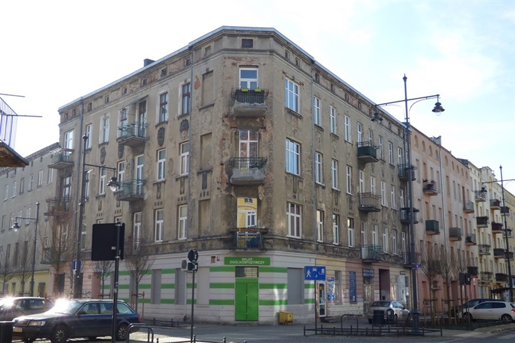 Narożna, trzypiętrowa kamienica stojąca przy zbiegu ulic Pogonowskiego 17 (dawniej ul. Zakątna) i al. 1 Maja (dawniej Pasaż Szulca) należała prawdopodobnie do Jankiela Dębińskiego. Projekt jej budowy powstał w 1912 r. Kolejnymi jej właścicielami byli m.in. Chaim-Dawid Szajn, następnie małżeństwo Hercko i Estera Szpiro. Pod tym adresem w różnych latach funkcjonowały m.in. zakład krawiecki Adeli Małyńskiej, sklep spożywczy Marty Konczak, sprzedaż manufaktury sztucznego jedwabiu Zysse vel Aleksandra Kona.
