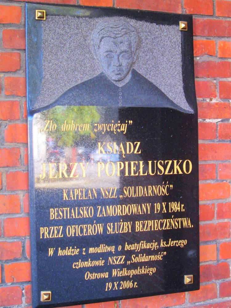 Na elewacji konkatedry znajduje się tablica pamiątkowa upamiętniająca księdza Jerzego Popiełuszkę. Ufundowana została 19 października 2006 roku przez członków NSZZ „Solidarność” Ostrowa Wielkopolskiego w rocznicę jego śmierci. Ksiądz Jerzy Popiełuszko był kapelanem „Solidarności”. Został bestialsko zamordowany 19 października 1984 roku przez oficerów Służby Bezpieczeństwa.
