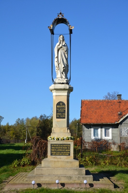 Figura Matki Bożej wieńczy wysoki cokół posadowiony na kilkustopniowej podstawie. W prostokątnej płycinie podstawy wstawiona jest tablica fundacyjna, z której dowiadujemy się kto figurę ufundował i dlaczego stanęła w tym miejscu. A oto treść widniejąca na tablicy „NA PAMIĄTKĘ 50-letniej UROCZYSTOŚCI SWEGO KAPŁAŃSTWA WYSTAWIŁ TEN POMNIK KS. J. PRZYBYŁO R.P. 1900.22.07. KARCZMA TU BYŁA LUDU ZGORSZENIEM, MARYA BĘDZIE BOGA UWIELBIENIEM”. Cokół również posiada płycinę, w której przytwierdzono tablicę inskrypcyjną o treści „O MARYO bez grzechu poczęta MÓDL SIĘ ZA NAMI”. Cokół wieńczy rzeźba Matki Bożej Różańcowej. Nad rzeźbą ozdobny metalowy daszek wsparty na czterech prętach.