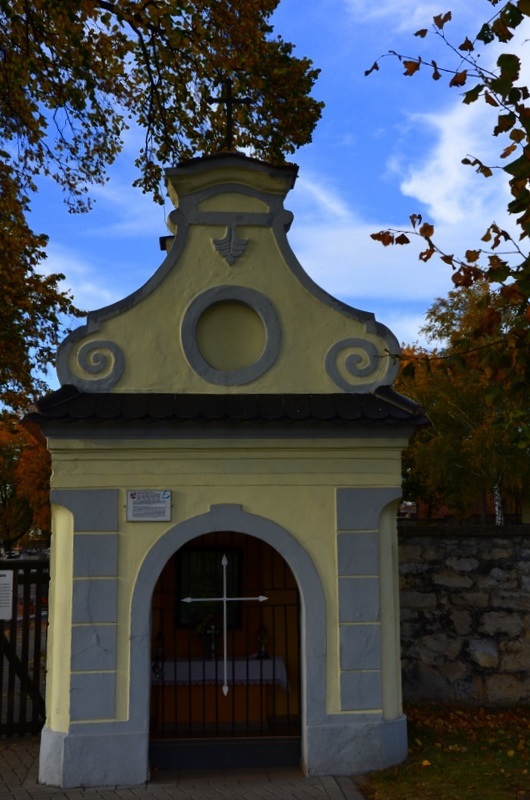 Kapliczka datowana na XVIII wiek stoi przy wejściu na miejscowy cmentarz. Jest to obiekt barokowy, murowany, na planie prostokąta, otynkowany i nakryty dwuspadowym dachem zakrytym od frontu i z tyłu attykami. Narożniki kapliczki zaokrąglone i obramowane pasami boniowań w tynku. Elewacja tylna i frontowa zwieńczone są attykami i zdobione spływami. Kapliczka pozbawiona jest okien. Wejście zamknięte półokrągło w obramieniu wykonanym w tynku. Wewnątrz murowany przyścienny ołtarz, nad którym we wnęce umieszczony jest obraz Najświętszego Serca Pana Jezusa.
