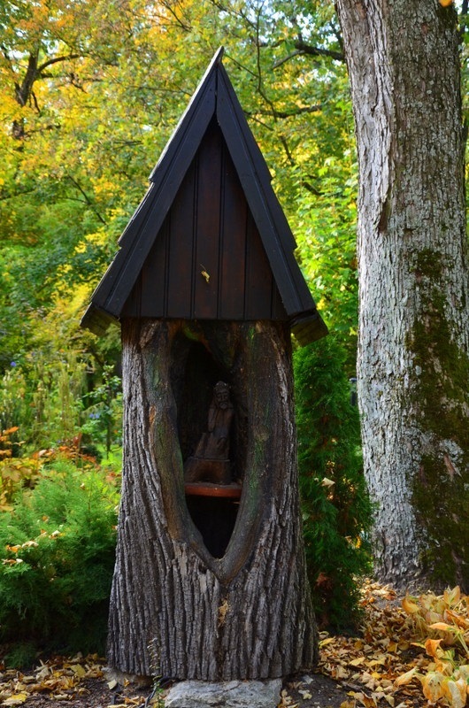 Współczesna kapliczka Chrystusa Frasobliwego usytuowana jest w parku pałacowym. Wykonana jest w pniu drzewa i nakryta dwuspadowym drewnianym daszkiem. Wewnątrz na drewnianym pieńku spoczywa ludowa, drewniana rzeźba Chrystusa Frasobliwego. Postać tradycyjnie podpiera głowę na prawej dłoni, a na głowie nałożoną ma koronę cierniową.
