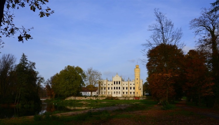 Hrabia Hermann von Seherr-Thoss nie tylko w poł. XIX w. przebudował barokowy pałac na styl neogotycki, ale również utrzymany w stylu barokowym ogród uległ przekształceniu na park krajobrazowy. Projekt parku wykonał Gustaw Meyer między innymi twórca miejskich ogrodów w Friedrischshain i Treptower Park w Berlinie. Realizację przedsięwzięcia hrabia Herman powierzył mistrzowi ogrodniczemu Eduardowi Petzeldowi, który rozbudował ogrody w Bad Muskau.