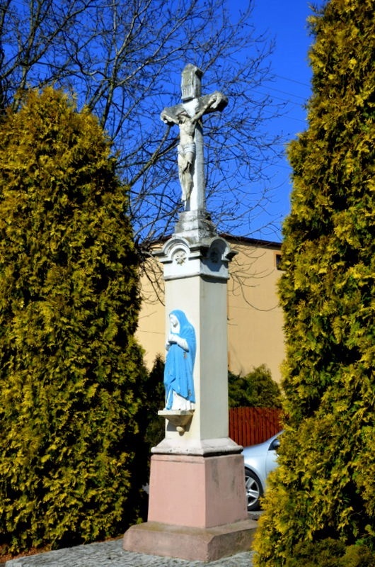Krzyż datowany na 1866 rok stoi nieopodal kościoła pw. św. Stanisława Biskupa i Męczennika. Podstawa postumentu dwuczęściowa. Druga, węższa część podstawy zwęża się ku górze. Na podstawie wysoki cokół zwieńczony gzymsem o łukowych wygięciach. Pod wygięciami ozdoby w kształcie rozety. Na frontowej ścianie cokołu, na przyściennej stopce, płaskorzeźba Matki Bożej. Krzyż wieńczący cokół posadowiony jest na kilkustopniowej stopce. Na krzyżu figura ukrzyżowanego Chrystusa, a na szczycie belki pionowy pofałdowany kartusz INRI.