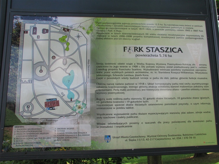 Parki powstały w różnych okresach czasu. W 1826 r. powstał park im. Staszica. W 1909 na Krajową Wystawę Rolnictwa i Przemysłu przybrały formę, na której wzorowano się rewaloryzując je w 2007 i 2008 r. Znajdują się tu obserwatorium astronomiczne, pawilon Muzeum Częstochowskiego, zagroda włościańska, drewniana altana. Park 3 Maja powstał w 1938 r. Znajdują się tu korty tenisowe, stoły szachowe oraz place zabaw.