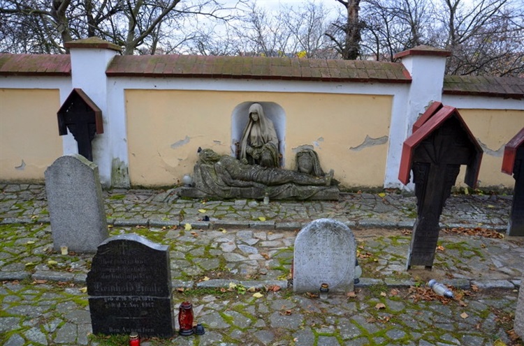 Szczególną uwagę zwracają tutaj dwa obiekty. Pierwszy to kompozycja rzeźbiarska przedstawiająca nietypową Pietę. Pan Jezus leży na kamiennej płycie, a przed nim klęczy Matka Boska. Figura Matki Boskiej umieszczona jest we wnęce muru.
